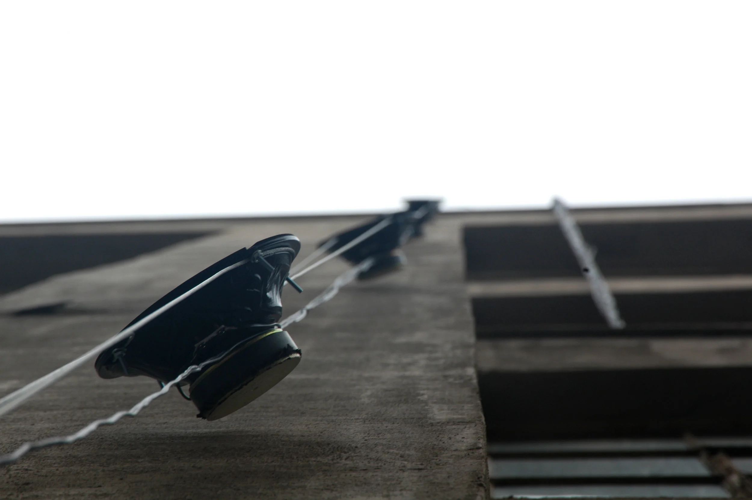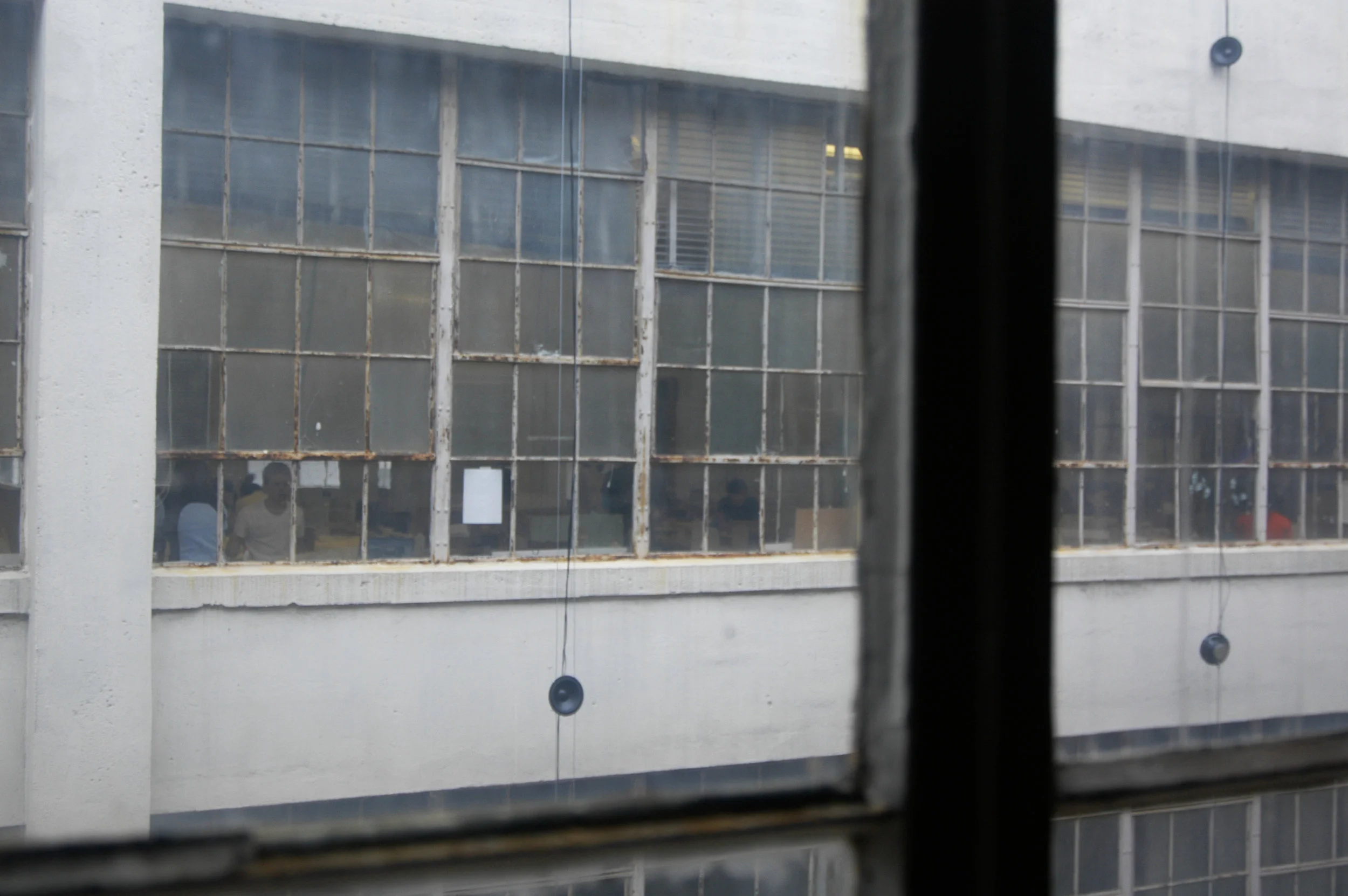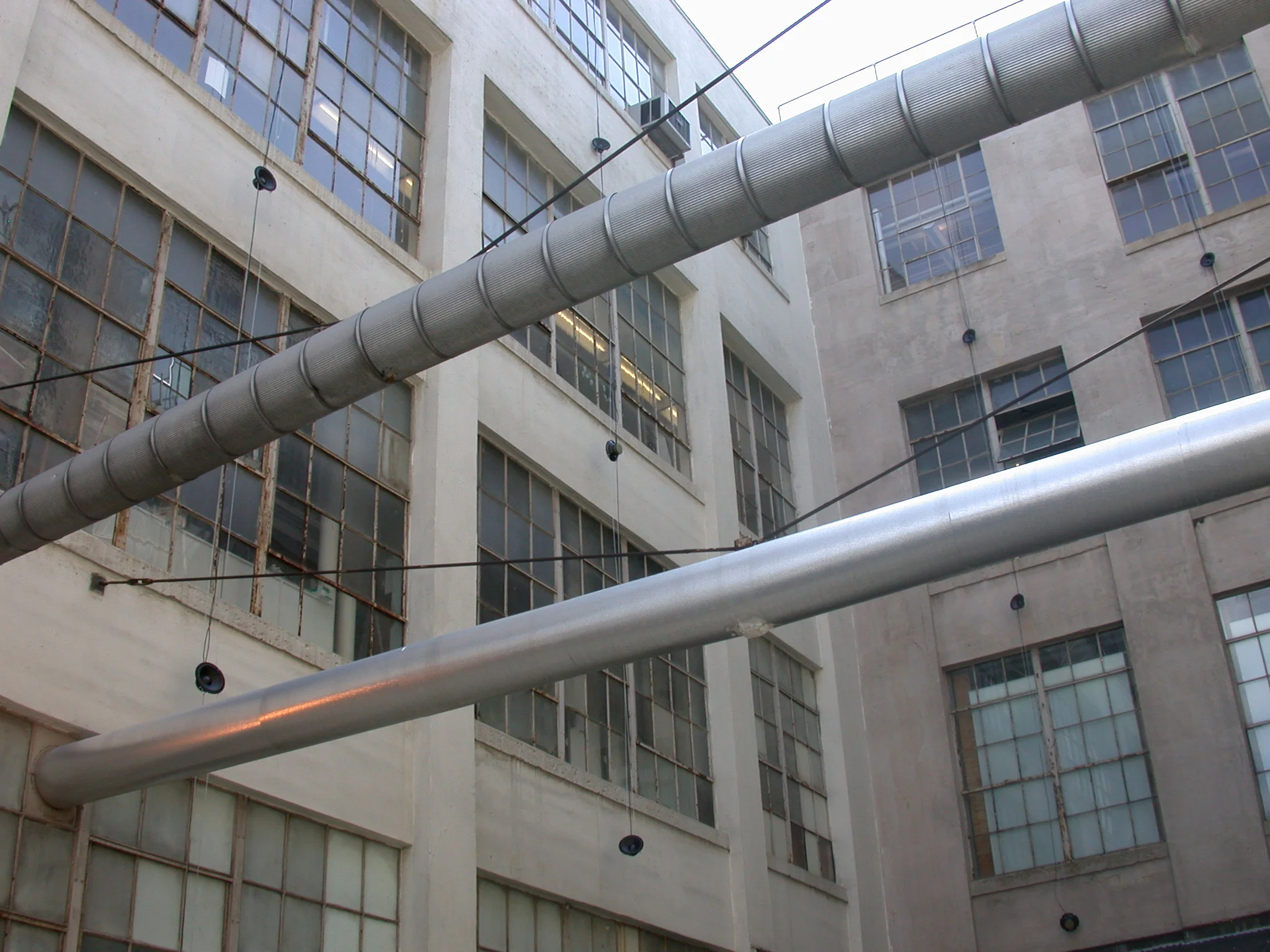 Oscillations was a temporary, site-specific public intervention on display in Cambridge, MA May 14-16 2004 utilizing 48 speakers across 3 four story facades of an U-shaped loading dock area. Responding to the history of the building, which in the 1950’s housed a manufacturer of instrumentation measurement systems and referencing equipment – oscillation circuits were one of their significant contributions to the technology field – I utilized sounds of audible oscillations, pure tonalities based on sine waves, that swing back and forth between the buildings’ facades. The sound was provided by 24 independent sound channels through 48 speakers ‘swinging’ the sound source spatially throughout the loading dock area. The etymology of oscillate is possibly derivative of the Latin word oscillum, a diminutive of “mouth”. I liked this reference for the speakers on the building façade becoming “small mouths” speaking from the history of the site, forming a chorus of the building’s past yet interweaving this voice with contemporary sounds of the busy street surrounding the building: the beep, beep, beep of delivery trucks backing up, the long, deep throaty call of a train passing by, and the clacking of containers being loaded onto trucks of the NECCO factory next door. This intermix of sound referencing past histories and current activities was a thought-provoking experience of the permanence of the site, posing the question “what has changed?”